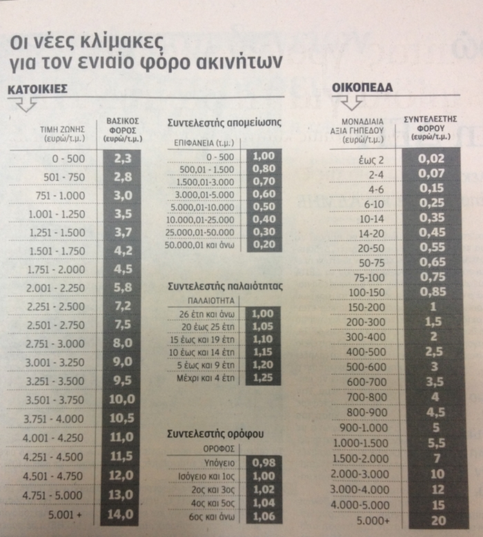 2. Οι συντελεστές ανέρχονται σε 20 και ξεκινούν από 2,3 ευρώ το τ.μ. για ακίνητα με τιμή ζώνης έως 500 ευρώ το τ.μ. και φθάνουν τα 14 ευρώ το τ.μ. για ακίνητα με τιμή ζώνης άνω των 5.000 ευρώ το τετραγωνικό μέτρο.