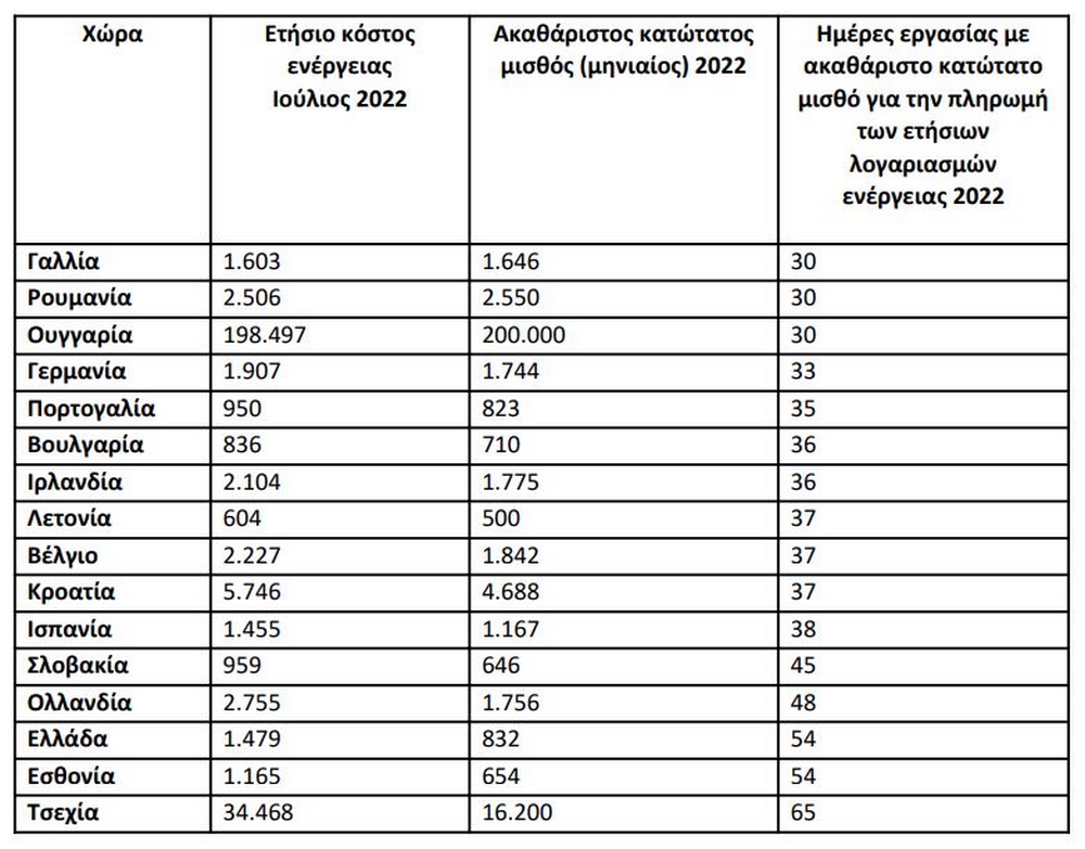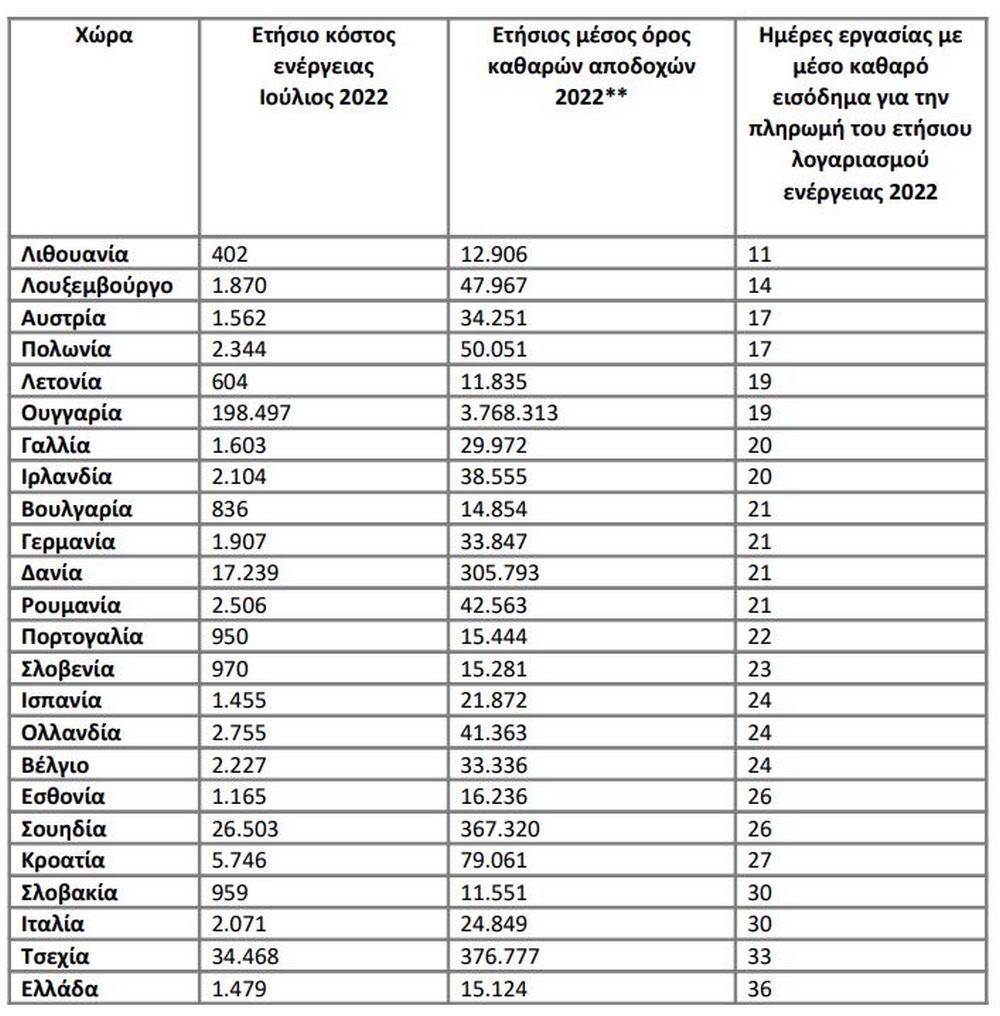 Ο μέσος ετήσιος λογαριασμός ενέργειας είναι μεγαλύτερος από τους μισθούς ενός μήνα για έναν εργαζόμενο με μέσο μισθό σε Σλοβακία, Ελλάδα, Τσεχία και Ιταλία, σύμφωνα με τη ΓΣΕΕ που επικαλείται τη Συνομοσπονδία Ευρωπαϊκών Συνδικάτων.