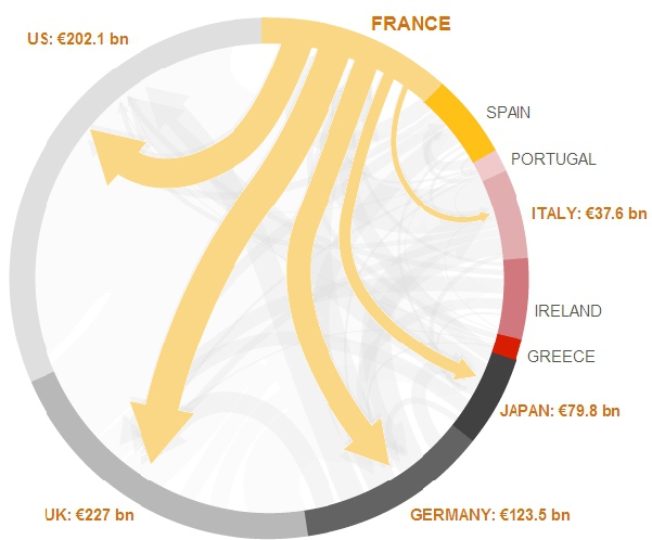 Η Γαλλία είναι η δεύτερη μεγαλύτερη οικονομία στην Ευρωζώνη, και είναι εκτεθειμένη λόγω των προβλημάτων των οφειλετών της. Οι τράπεζές της κατέχουν ομόλογα της Ελλάδας, της Ιταλίας, αλλά και της Ισπανίας.