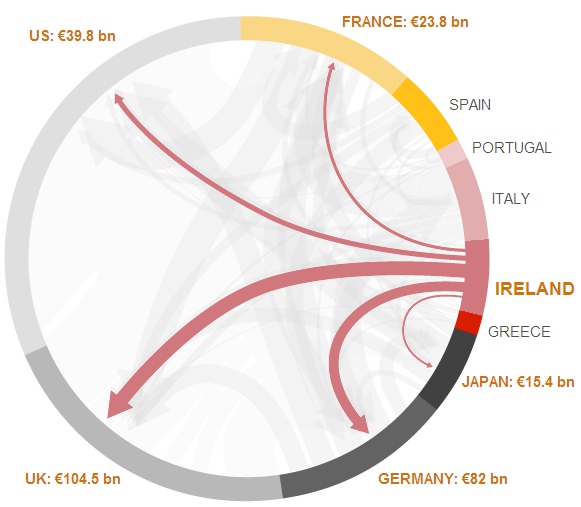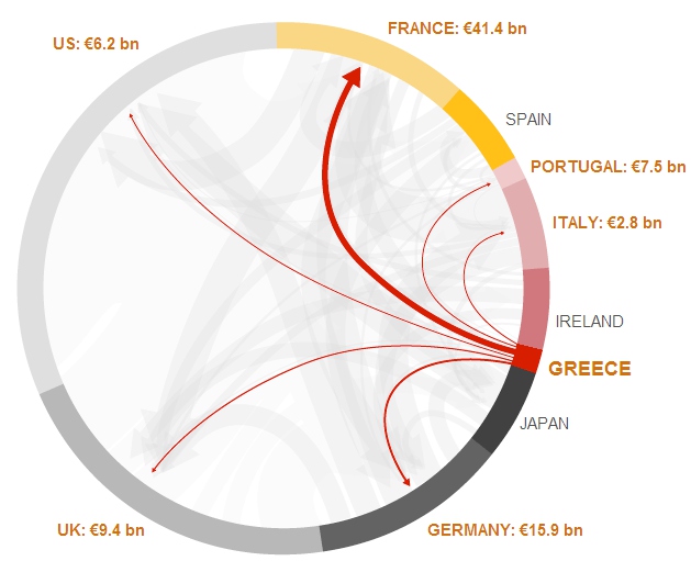 Τα βέλη βάσει πάχους καθορίζουν το μέγεθος της οφειλής και κατευθύνονται από τον οφειλέτη προς τον πιστωτή. Το χρώμα κάθε χώρας υποδηλώνει το σε πόσο κρίσιμη κατάσταση βρίσκεται η κάθε οικονομία. Τέλος το γράφημα είναι δομημένο βάσει των στοιχείων μέχρι τον Ιούνιο του 2011.