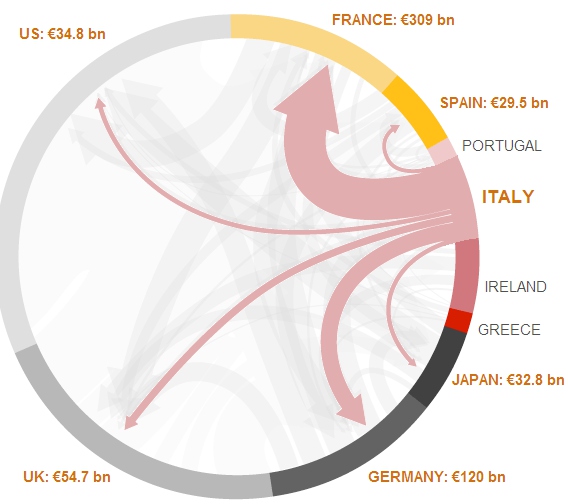 Το γραφήματα είναι μια προσπάθεια να καταλάβουμε την δίνη της κρίσης. Πρώτα Ελλάδα, Ιρλανδία, Πορτογαλία, και πλέον η Ιταλία, αντιμετωπίζουν τον υπαρκτό κίνδυνο της χρεωκοπίας. Καθώς οι δανεισμοί των χωρών γίνονται σε παγκόσμια κλίμακα, καμία «δύσκολη οικονομική κατάσταση» δεν αφήνει κανέναν ανεπηρέαστο.