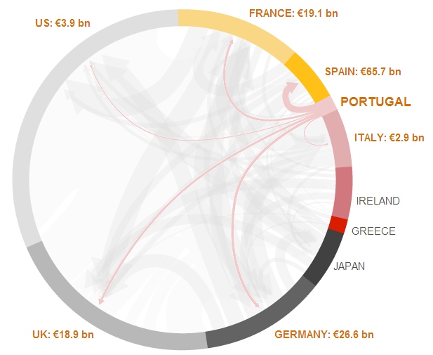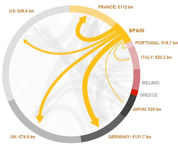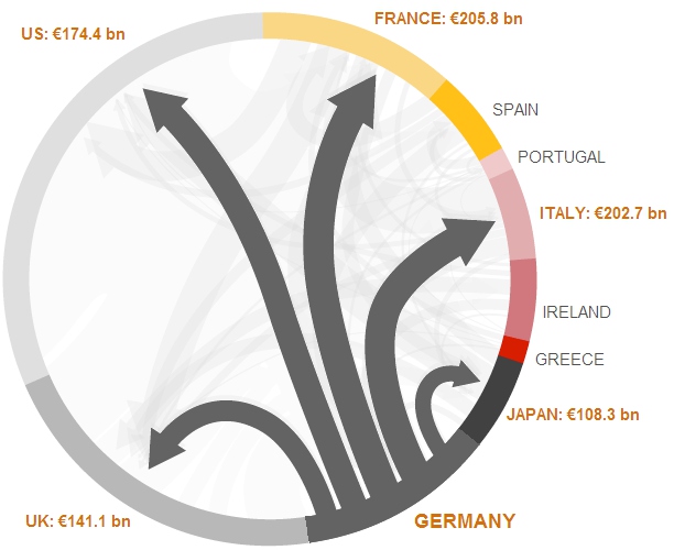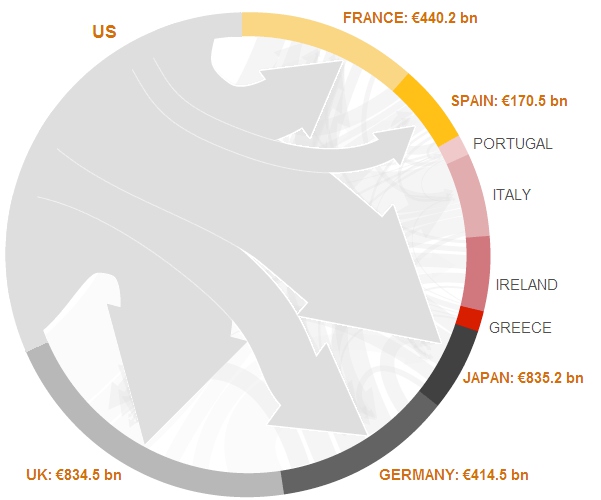 Στα γραφήματα που ακολουθούν έχουν τοποθετηθεί οι “βασικοί παίκτες” της Ευρωζώνης, αλλά και της παγκόσμιας οικονομίας- Η.Π.Α, Ιαπωνία-. Μέσα από “βέλη” παρατηρούμε σε ποιας χώρας τις τράπεζες οφείλει το κάθε κράτος.