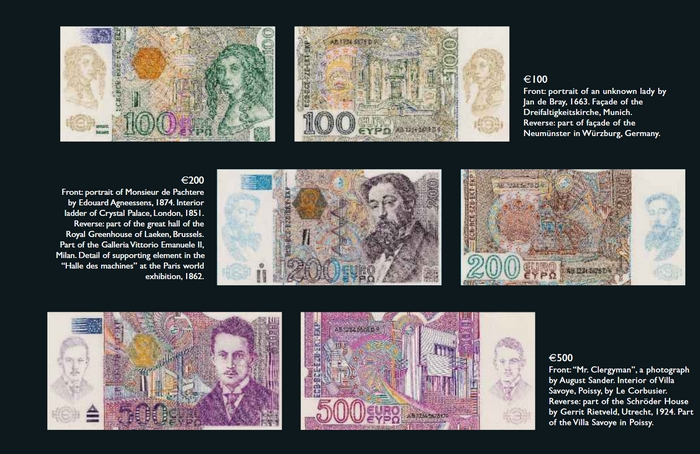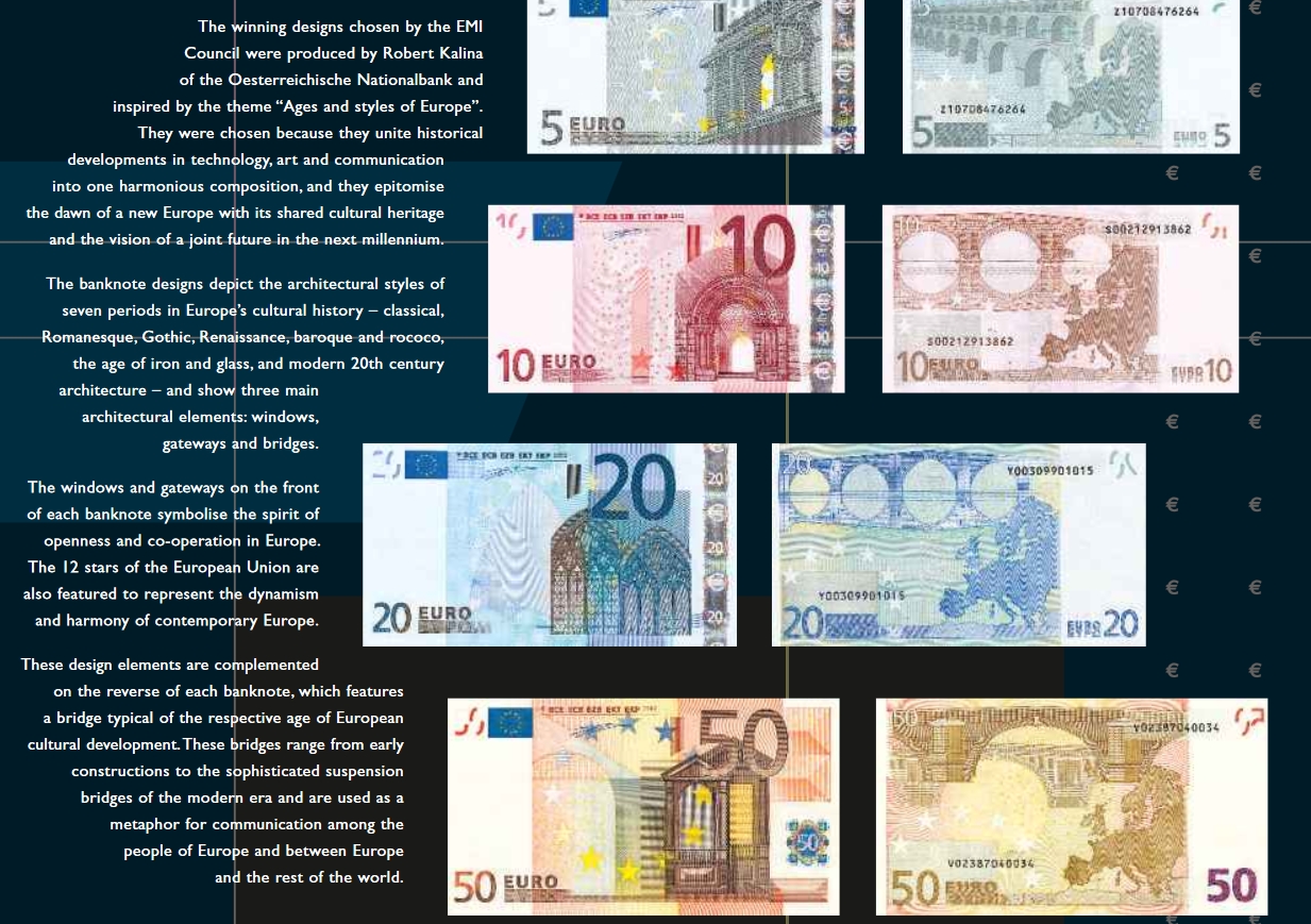 Για παράδειγμα το τραπεζογραμμάτιο των 5€ φέρει ένα παράδειγμα κλασικής αρχιτεκτονικής, αυτό των 10€, ένα παράδειγμα Ρωμανικής αρχιτεκτονικής, των 20€, ένα παράδειγμα Γοτθικής αρχιτεκτονικής, των 50€, ένα παράδειγμα Αναγεννησιακής αρχιτεκτονικής, των 100€, ένα παράδειγμα Μπαρόκ & Ροκοκό αρχιτεκτονικής, των 200€, ένα παράδειγμα αρχιτεκτονικής Αρ Νουβό και των 500€, ένα παράδειγμα μοντέρνας αρχιτεκτονικής.