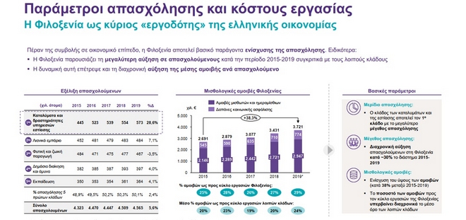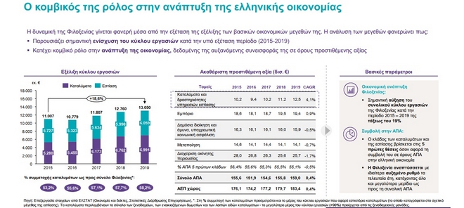 Στη μελέτη «Η στρατηγική σημασία της Φιλοξενίας για την Ελλάδα», αποτυπώνεται το γεγονός ότι κατά την διάρκεια της οικονομικής κρίσης, ο τομέα της Φιλοξενίας όχι μόνο απορρόφησε μεγάλο μέρος του εργατικού δυναμικού της χώρας μας, ούτε απλά διεύρυνε την ακαθάριστη προστιθέμενη αξία, αλλά είναι και ο μόνος κλάδος που επενδύει ετησίως στην αναβάθμιση των μονάδων του.