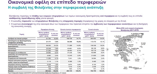 Σύμφωνα με την ανάλυση, η διάχυση ωφελειών της Φιλοξενίας στην Ελλάδα επιμερίζεται σε 17 κλάδους οικονομικής δραστηριότητας, που αφορούν τις απαιτούμενες κατασκευαστικές εργασίες, τη λιανική και χονδρική πώληση και τη μεταποίηση των απαιτούμενων εμπορευμάτων (επίπλων, ειδών διακόσμησης κλπ.) καθώς και την επίβλεψη των έργων και την παροχή συμβουλευτικών υπηρεσιών καθώς και σε 9 επηρεαζόμενους τομείς δραστηριότητας από το σύνολο των 20 τομέων της οικονομίας (45% των τομέων της οικονομίας) που επηρεάζονται άμεσα από τη Φιλοξενία. Πρόκειται για τους τομείς: Βιομηχανία – μεταποίηση, Παροχή ηλεκτρικού ρεύματος, φυσικού αερίου, ατμού και κλιματισμού, Κατασκευές, Χονδρικό και λιανικό εμπόριο, Μεταφορά και αποθήκευση, Ενημέρωση και επικοινωνία, Επιστημονικές και τεχνικές δραστηριότητες, Διοικητικές και υποστηρικτικές δραστηριότητες.