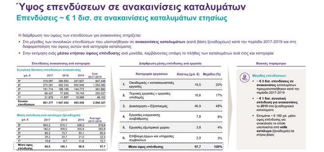 Παράλληλα η έρευνα από τις επενδύσεις στη Φιλοξενία (σύνολο καταλυμάτων και μονάδων εστίασης) καταγράφει μέση ετήσια συνεισφορά στην οικονομία της χώρας ποσού 1,5 δισ. ευρώ. Το ύψος των ετήσιων επενδύσεων σε ανακαινίσεις αγγίζει το 1 δισ. ευρώ, ενώ η δημιουργία νέων καταλυμάτων φθάνει τα 170 εκατ. ευρώ. Επίσης οι λοιπές επενδύσεις σε καταλύματα ανέρχονται στα 300 εκατ. ευρώ ετησίως και σε 140 εκατ. ευρώ ανέρχονται τα κονδύλια επενδύσεων στις μονάδες εστίασης. Όπως υπογραμμίζει η μελέτη η Φιλοξενία αποτελεί τον πρώτο κλάδο σε επίπεδο προσφοράς θέσεων εργασίας (1 στις 4 θέσεις εργασίας είναι αποτέλεσμα της Φιλοξενίας).