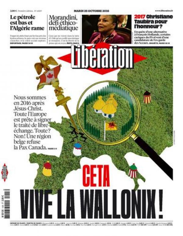 Εξ ου και οι διθύραμβοι των γαλλικών ΜΜΕ, όπως η Liberation που κυκλοφορεί με εξώφυλλο εμπνευσμένο από τον Αστερίξ και παρομοιάζει την Βαλονία με το μικρό χωριό που αντιστεκόταν στους Ρωμαίους. “Δεν αστειευόμαστε με αυτό το ρόλο του ‘μικρού γαλατικού χωριού'” έλεγε στο βαλονικό κοινοβούλιο ένας από τους βουλευτές των σοσιαλιστών. Έτσι και η κεντροαριστερή εφημερίδα μετατρέπει το εξώφυλλό της σε ένα τεύχος του Αστερίξ. “Είμαστε στο έτος 2016 μ.Χ. Όλη η Ευρώπη είναι έτοιμη να υπογράψει τη συνθήκη ελεύθερων συναλλαγών. Όλη; Όχι! Μια βελγική περιοχή αρνείται τη συνθηκολόγηση με τον Καναδά” αναφέρει το άρθρο.