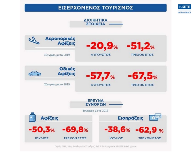 Αναφορικά με τις ταξιδιωτικές εισπράξεις κατά το πρώτο οκτάμηνο του έτους και σύμφωνα με το ΙΝΣΕΤΕ, εμφάνισαν μείωση κατά 62,9% σε σύγκριση με την αντίστοιχη περίοδο του 2019 και διαμορφώθηκαν στα 3.383 εκατ. ευρώ. Η εξέλιξη αυτή οφείλεται στην πτώση των εισπράξεων από κατοίκους των χωρών της ΕΕ-27 κατά -51,7%, οι οποίες διαμορφώθηκαν στα 2.318 εκατ. Ευρώ, καθώς και των εισπράξεων από κατοίκους των χωρών εκτός της ΕΕ-27 κατά -74,6%, οι οποίες διαμορφώθηκαν στα 1.037 εκατ. Ευρώ. Ειδικότερα, οι εισπράξεις από τη Γερμανία μειώθηκαν κατά 53,9% και διαμορφώθηκαν στα 671 εκατ. ευρώ, ενώ οι εισπράξεις από τη Γαλλία μειώθηκαν κατά 37,9% και διαμορφώθηκαν στα 345 εκατ. ευρώ. Η χαμηλότερη μείωση σημειώθηκε στις εισπράξεις από τη Γαλλία κατά –37,9% και διαμορφώθηκαν στα 345 εκατ. ευρώ.