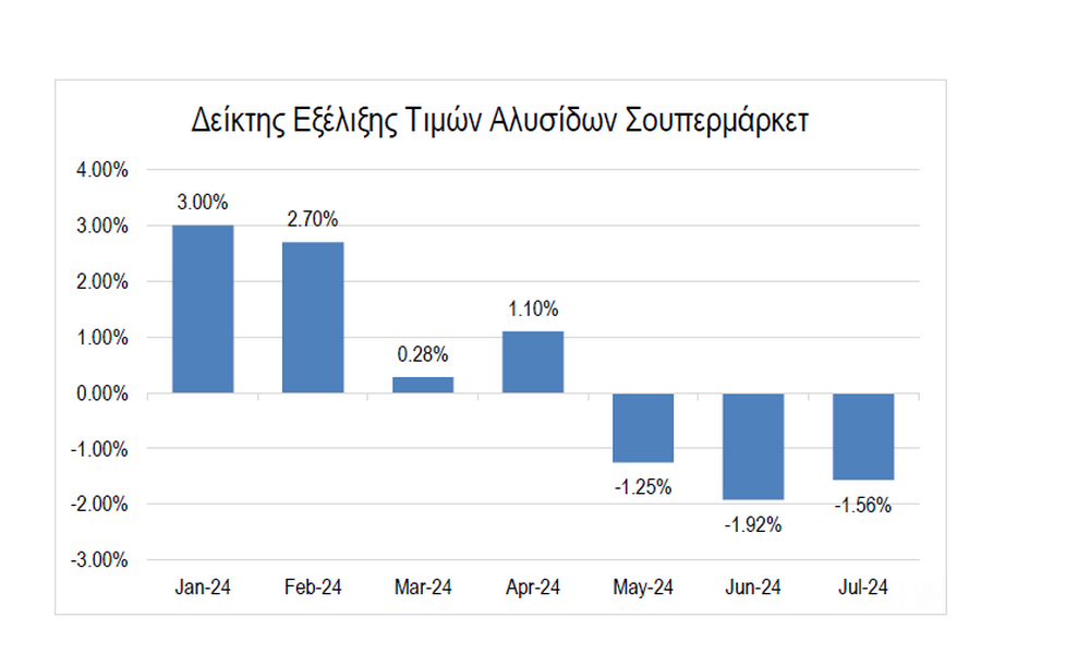 Αρνητικός πληθωρισμός καταγράφεται στα σούπερ μάρκετ τον Ιούλιο, για τρίτο συνεχόμενο μήνα, σύμφωνα με την έρευνα του Ινστιτούτου Έρευνας Λιανεμπορίου Καταναλωτικών Αγαθών (ΙΕΛΚΑ).