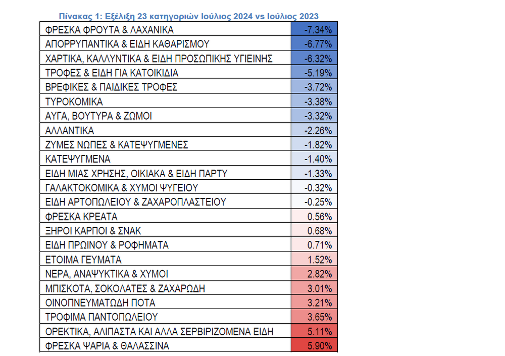 Ειδικότερα, οι τιμές των προϊόντων στα σούπερ μάρκετ καταγράφονται μειωμένες κατά μέσο όρο 1,56% σε σχέση με τον Ιούλιο 2023 ενώ οι 13 από τις 23 κατηγορίες προϊόντων σουπερμάρκετ που εξετάζονται στο πλαίσιο της έρευνας καταγράφουν μείωση τιμών.