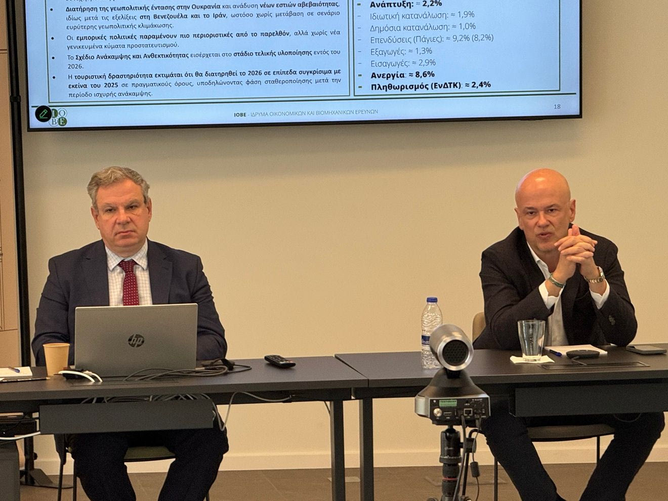 Για το 2026, το ΙΟΒΕ διατηρεί αμετάβλητη την εκτίμηση για ανάπτυξη στο +2,2%, στο πλαίσιο ενισχυμένων επενδύσεων και ανθεκτικής κατανάλωσης με βάση όσα αναφέρθηκαν κατά την παρουσίαση της Τριμηνιαίας Έκθεση για την Ελληνική Οικονομία για το 4ο τρίμηνο του 2025.