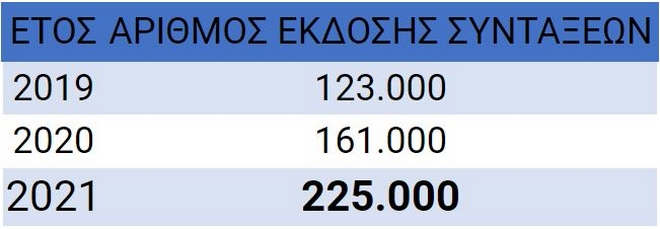 • Το 2021 υπήρξε χρονιά ρεκόρ για τον ΕΦΚΑ στην έκδοση νέων συντάξεων, φτάνοντας τις 225.000,ενώ το 2020 είχαν εκδοθεί 161.000 και το 2019 μόλις 123.000. Ειδικά σε σχέση με το 2019 υπήρξε αύξηση της έκδοσης νέων συντάξεων κατά 83%!