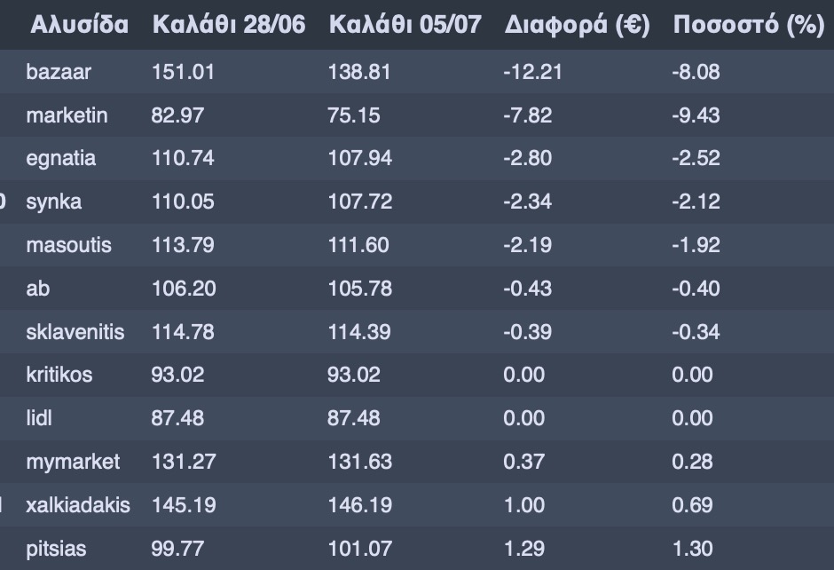 Αναλυτικά στον πίνακα που επισυνάπτεται το κόστος του «Καλαθιού του Νοικοκυριού» ανά σούπερ μάρκετ και η μεταβολή του από την 35η στην 36η εβδομάδα.