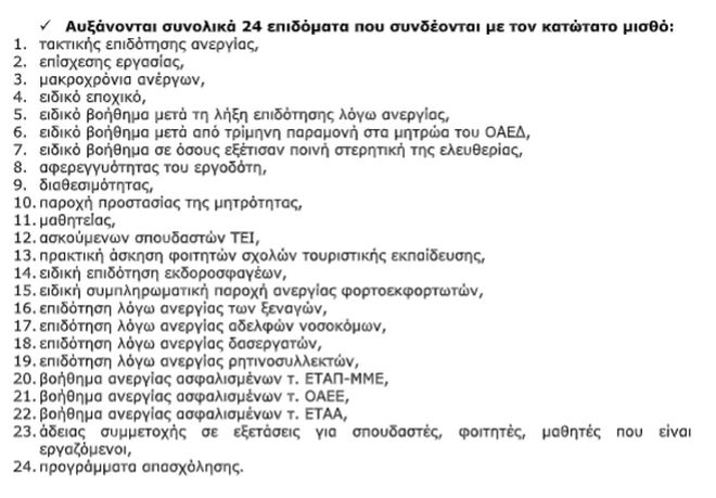 – Αυξάνονται συνολικά 24 επιδόματα που συνδέονται με τον κατώτατο μισθό.