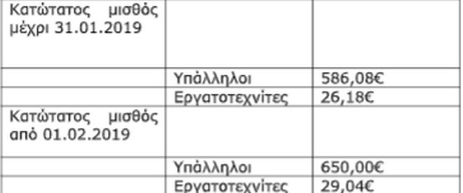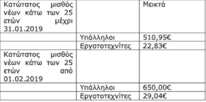 Σημειώνεται ότι η αύξηση του κατώτατου μισθού και η κατάργηση του υποκατώτατου μισθού από 01/02/2019 διαμορφώνει τα εξής δεδομένα: