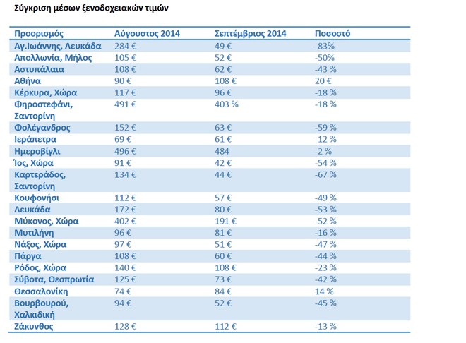 Αξίζει να σημειωθεί ότι η Ελλάδα αποτελεί το κράτος της Ευρώπης με τη μεγαλύτερη μείωση τιμών εν συγκρίσει με τον Αύγουστο 2014 με ποσοστό 23 τοις εκατό και τη μέση ξενοδοχειακή τιμή να κυμαίνεται στα 121 ευρώ έναντι 158 ευρώ τον προηγούμενο μήνα. Το δεύτερο μεγαλύτερο ποσοστό μείωσης τιμών στην Ευρώπη ανήκει στην Κύπρο (16 τοις εκατό) με τη μέση ξενοδοχειακή τιμή να διαμορφώνεται στα 123 ευρώ για το Σεπτέμβριο, έναντι 147 ευρώ για το μήνα Αύγουστο.