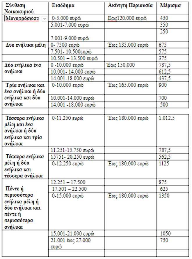 Θα πρέπει επίσης το νοικοκυριό να έχει ακίνητη περιουσία από 120.000 ευρώ έως και 180.000 ευρώ (και πάλι αθροιστικά για όλα τα μέλη του)