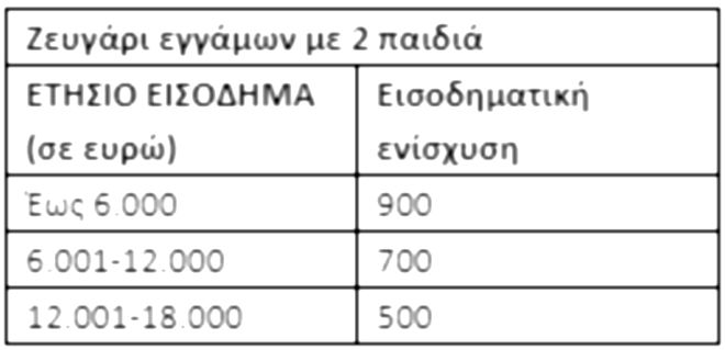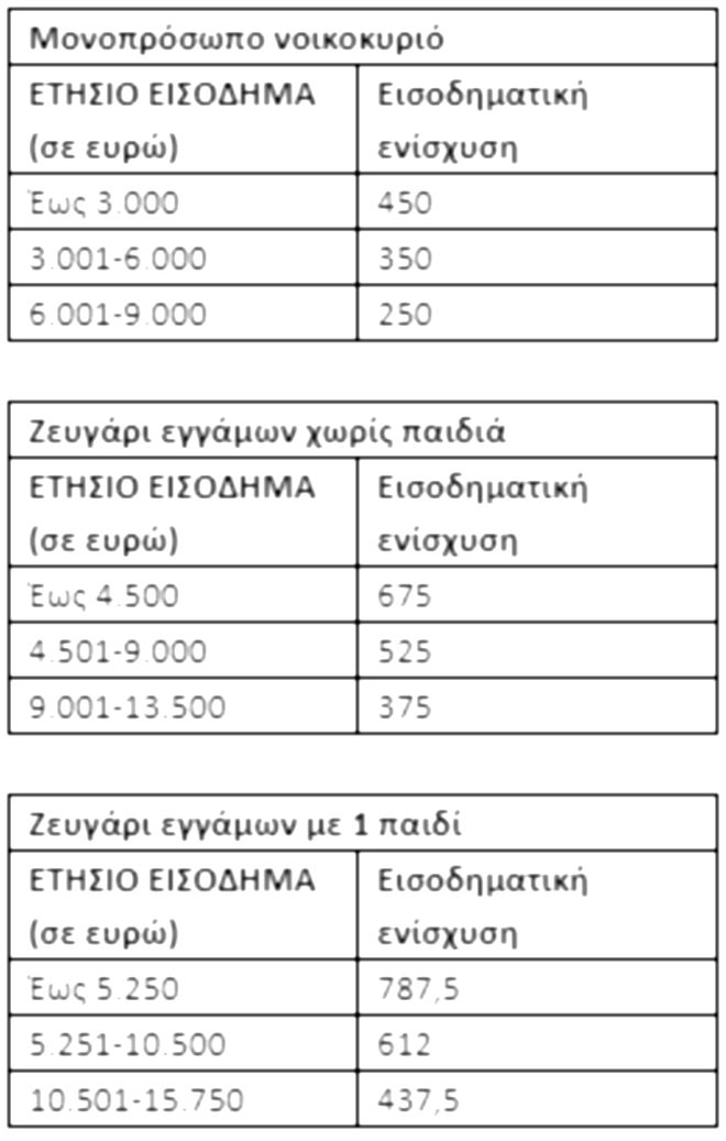 Έτσι για ένα ζευγάρι εγγάμων χωρίς παιδιά η εισοδηματική ενίσχυση θα κυμαίνεται από 375 έως 675 ευρώ, για εγγάμους με ένα ανήλικο παιδί από 450 έως 775 ευρώ και για εγγάμους με δύο ανήλικα παιδιά από 500 έως 900 ευρώ.