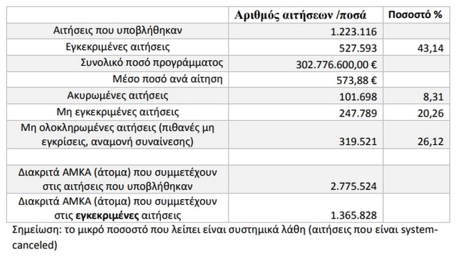 Επίσης, γίνεται διαρκής προσπάθεια για την αντιμετώπιση τεχνικών προβλημάτων στο σύστημα της ΗΔΙΚΑ, η οποία όπως χαρακτηριστικά αναφέρει σε σχετικό δελτίο τύπου «Την Δευτέρα, και ενώ είχαμε 60.000 ταυτόχρονους χρήστες, υπήρξαν καθυστερήσεις λόγω αδυναμίας του μηχανισμού της ΑΑΔΕ να τακτοποιήσει τους χρήστες εξαιτίας απρόσμενα μεγάλου φόρτου». Ο γ.γ. κοινωνικής πρόνοιας κ. Δημήτρης Καρέλας μιλώντας χθες στην ΕΡΤ, εξέφρασε την εκτίμηση ότι θα εγκριθούν τελικά περίπου 1.280.000 αιτήσεις. Οι μοναδικές επισκέψεις στην ιστοσελίδα ήταν πάνω από 2.000.000 από το βράδυ της Κυριακής, ενώ οι επισκέψεις σελίδων ξεπέρασαν τα 20.000.000.