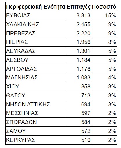 Ο πιο δημοφιλής προορισμός ήταν η Εύβοια, ενώ ακολούθησαν η Χαλκιδική και η Πρέβεζα. Ενδεικτικά, οι 15 περιφερειακές ενότητες με τον μεγαλύτερο αριθμό ενεργοποιημένων επιταγών σε τουριστικά καταλύματα κατά το πρώτο δεκαπενθήμερο του Αυγούστου 2023 είναι οι εξής: