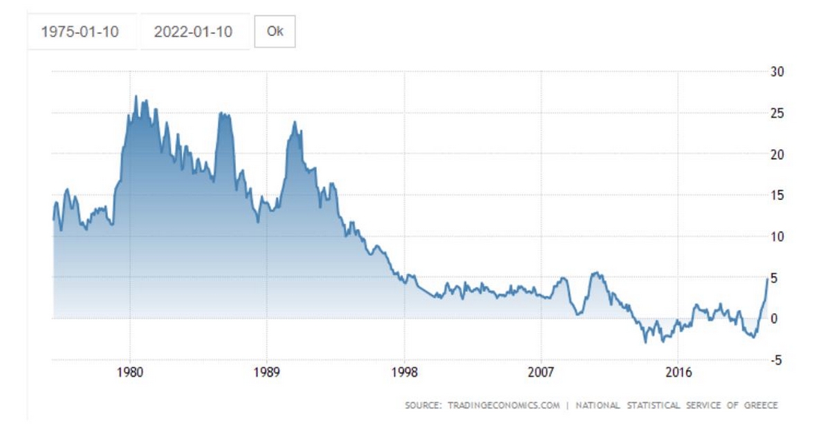 Ο πληθωρισμός είχε -ευτυχώς- ξεχαστεί από τον μέσο πολίτη τα τελευταία 20-25 χρόνια ως κάτι για το οποίο θα έπρεπε να ανησυχεί. Οι εποχές που ζήσαμε από την δεκαετία του 1970 με υψηλό πληθωρισμό της τάξης του 10% ή και 25%, έχουν ξεχαστεί ως πολύ μακρινές. Η ανεξαρτητοποίηση και ο αποκλεισμός του ελέγχου από την κυβέρνηση στην Τράπεζα της Ελλάδος που επιτεύχθηκε την δεκαετία του 1990, έφερε στην Ελλάδα όπως και σε όλες τις αναπτυγμένες χώρες που έκαναν το ίδιο, την λεγόμενη νομισματική σταθερότητα – εξαφάνισε τον πληθωρισμό ως καθημερινό πρόβλημα του πολίτη αλλά και της οικονομικής πολιτικής. Πριν από την ελληνική κρίση χρέους, ο πληθωρισμός ήταν της τάξης του 2%-4%. Μέσα στην κρίσης και στην αστάθεια και αβεβαιότητα που υπήρξε την 5ετία 2013-2017, φτάσαμε και σε αποπληθωρισμό, αρνητικό, δηλαδή, πληθωρισμό.