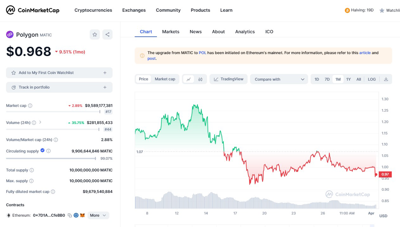 Η πρόσφατη πτώση της τιμής του MATIC έχει τραβήξει την προσοχή πολλών επενδυτών. Από το υψηλό των 1,27 δολαρίων στις 14 Μαρτίου, η αξία της MATIC έχει μειωθεί κατά σημαντικό ποσό, αφού πλέον βρίσκεται στα περίπου 0,96 δολάρια. Η πτώση αυτή οφείλεται σε διάφορους παράγοντες, συμπεριλαμβανομένων των τεχνικών δεικτών που υποδηλώνουν περαιτέρω πτώση των τιμών και της αυξημένης πίεσης πώλησης στην αγορά.