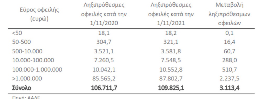 Σύμφωνα με τα στοιχεία της ΑΑΔΕ, όπως αναλύονται από το Γραφείο Προϋπολογισμού της Βουλής, το συνολικό ληξιπρόθεσμο υπόλοιπο στο τέλος του Οκτωβρίου του 2021, διαμορφώθηκε στα 109,8 δις ευρώ, αυξημένο κατά 3,1 δις ευρώ σε σχέση με τον Οκτώβριο του 2020. Η αύξηση αυτή υπολογίζεται από (α) τις νέες ληξιπρόθεσμες οφειλές ύψους 7 δις ευρώ μείον (β) τις εισπράξεις και διαγραφές 5,2 δις ευρώ, συν (γ) τις ληξιπρόθεσμες οφειλές κατά την 1/11/2020 που βεβαιώθηκαν μεταγενέστερα ύψους 1,3 δις ευρώ.