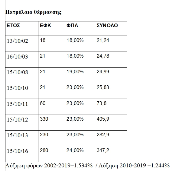 Στο πετρέλαιο κίνησης, αντίστοιχα, με τιμή 1,3850 ευρώ, οι φόροι είναι 0,6900 ευρώ με ποσοστό 49,82%, ενώ στο πετρέλαιο θέρμανσης, με τιμή 1,0660 ευρώ, οι φόροι είναι 0,4962 ευρώ με ποσοστό 46,55%.