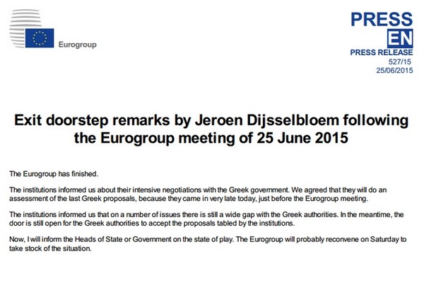 “Οι θεσμοί μας ενημέρωσαν για τις εντατικές διαπραγματεύσεις τους με την ελληνική κυβέρνηση. Συμφωνήσαμε, ότι θα συνεχιστεί μία επεξεργασία των ελληνικών προτάσεων, γιατί έφτασαν πολύ αργά σήμερα, μόλις πριν αρχίσει το Eurogroup. Οι θεσμοί μας ενημέρωσαν, ότι μεταξύ αυτών και της Ελλάδας υπάρχει μεγάλο κενό σε αρκετά ζητήματα. Στο μεταξύ, η πόρτα είναι ακόμη ανοιχτή για την ελληνική πλευρά, να δεχτεί την πρόταση των θεσμών”.