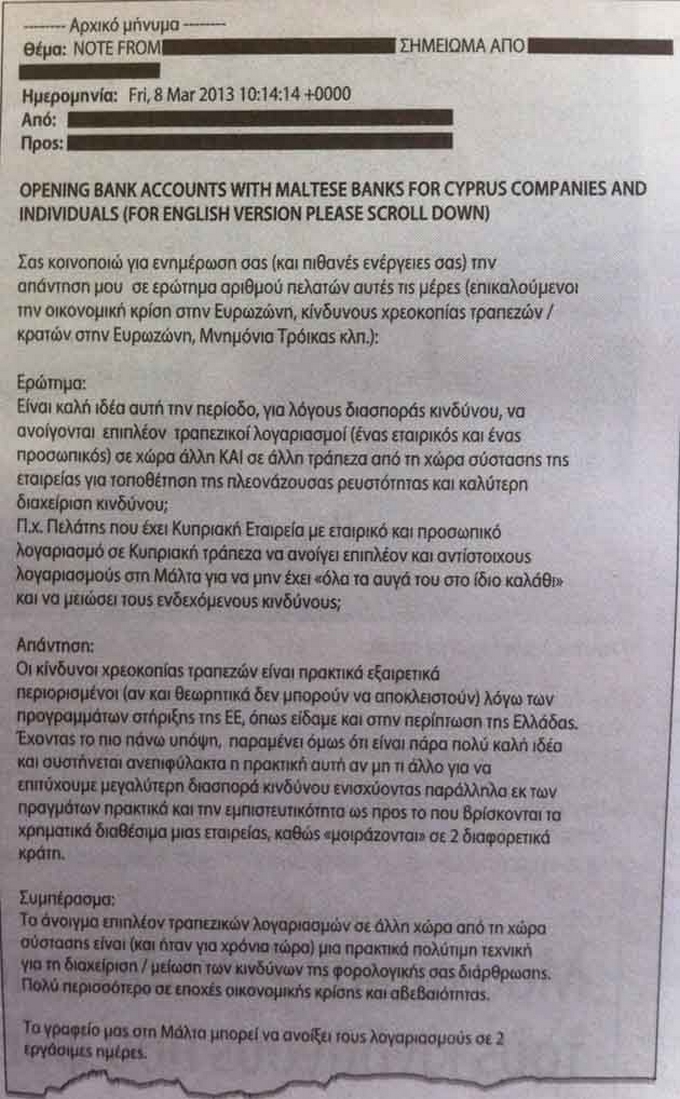Με το e-mail, που είναι γραμμένο σε αγγλικά και ελληνικά, “συστήνεται ανεπιφύλακτα η πρακτική αυτή”, δηλαδή το άνοιγμα λογαριασμών στην Μάλτα, “αν μη τι άλλο για να επιτύχουμε μεγαλύτερη διασπορά κινδύνου, ενισχύοντας παράλληλα εκ των πραγμάτων πρακτικά και την εμπιστευτικότητα ως προς το πού βρίσκονται τα χρηματικά διαθέσιμα μιας εταιρείας, καθώς μοιράζονται σε διαφορετικά μέρη”.