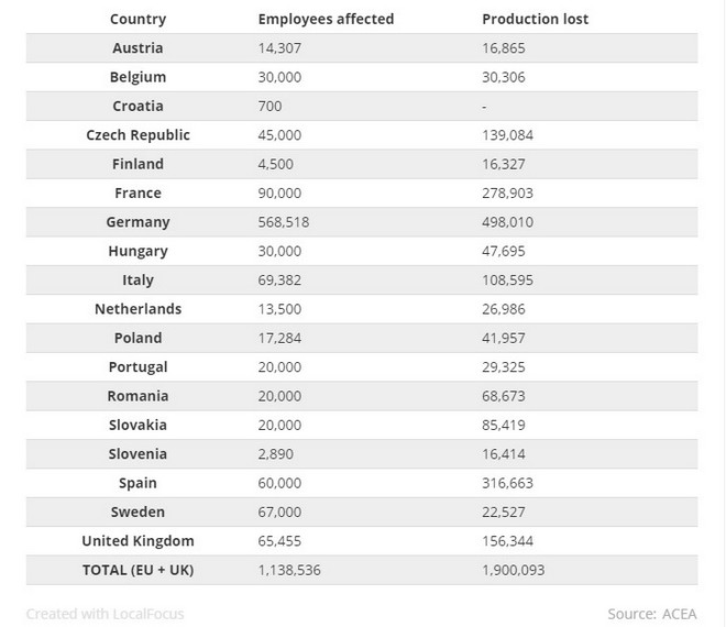 Πολύ μεγάλος είναι ο αντίκτυπος της υγειονομικής κρίσης του κορονοϊού / COVID-19, τόσο σε θέσεις εργασίας όσο και στην παραγωγή οχημάτων στην Ευρώπη. Η ACEA, η Ένωση Ευρωπαίων Κατασκευαστών Αυτοκινήτων, που μετά 19 μέλη, παρουσιάζει αναλυτικά τα τεκταινόμενα σε καθένα από τα 27 κράτη μέλη της ΕΕ, συν το Ηνωμένο Βασίλειο.