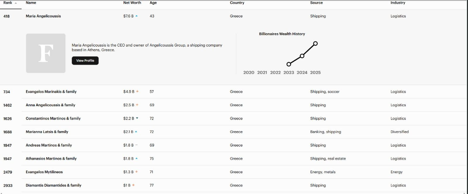 Σε ό,τι αφορά την Ελλάδα ή καλύτερα τους επιχειρηματίες που είναι δηλωμένοι ως Έλληνες, έχουμε εννέα δισεκατομμυριούχους, με την Μαρία Αγγελικούση (ναυτιλία) να ηγείται του εγχώριου… σχήματος, με 7.6 δισεκατομμύρια δολάρια. Αξία που της δίνει την 418η θέση στη λίστα -πέρυσι ήταν στο Νο432.