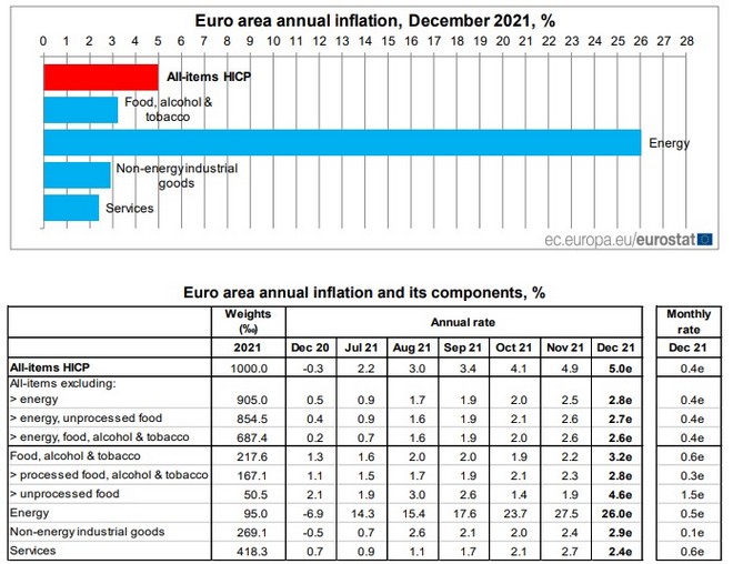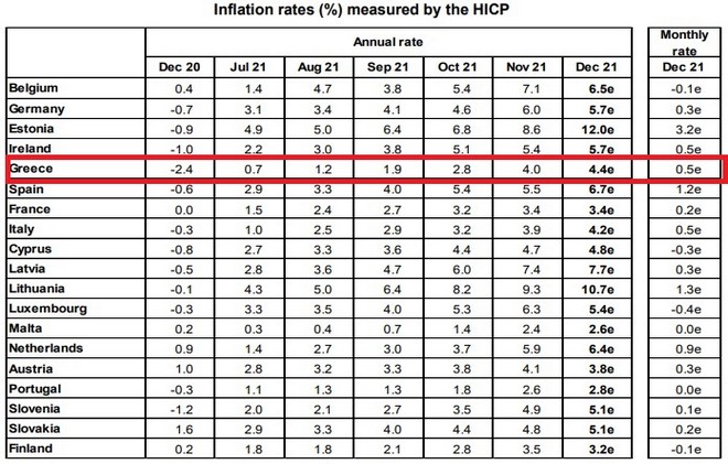 Σημειώνεται ότι με βάση τα στοιχεία της ΕΛΣΤΑΤ, ο πληθωρισμός τον Νοέμβριο ανερχόταν στο 4,8%, ενώ στις 13/1 αναμένεται να ανακοινώσει τα στοιχεία για τον Δεκέμβριο. Η διαφορά με τα στοιχεία της Eurostat οφείλεται στο ότι η ΕΛΣΤΑΤ χρησιμοποιεί για τις σταθμίσεις τον εθνικό δείκτη τιμών καταναλωτή, ενώ η Eurostat χρησιμοποιεί τον εναρμονισμένο δείκτη, δηλαδή τον ίδιο «καλάθι» για τον προσδιορισμό του δείκτη για όλες τις χώρες της Ευρωζώνης.