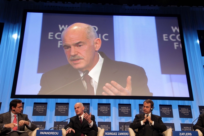 Στο ετήσιο οικονομικό φόρουμ του Νταβός της Ελβετίας τον Ιανουάριο του 2010 ο Έλληνας Πρωθυπουργός εκτός από ήταν πιο διάσημος από ότι νόμιζε (λόγω του ενδιαφέροντος που έδειξαν στο πρόσωπο του ξένα MME) κατάλαβε ότι το πρόγραμμα διάσωσης ήταν προ των πυλών. Ο τότε επικεφαλής του ΔΝΤ Ντομινίκ Στρος Καν στην συνάντηση που είχε σε μια κουζίνα ξενοδοχείου όπου εξελίσσονταν οι εργασίες του φόρουμ, δήλωσε πρόθυμος για βοήθεια της Ελλάδας αλλά επεσήμανε το ενδεχόμενο να αντιδράσουν οι Ευρωπαίοι. Οι Ευρωπαίοι ηγέτες όμως είδαν την κρίση να έρχεται και ζήτησαν από τον Έλληνα Πρωθυπουργό να αλλάξει πορεία και να πάρει μέτρα.