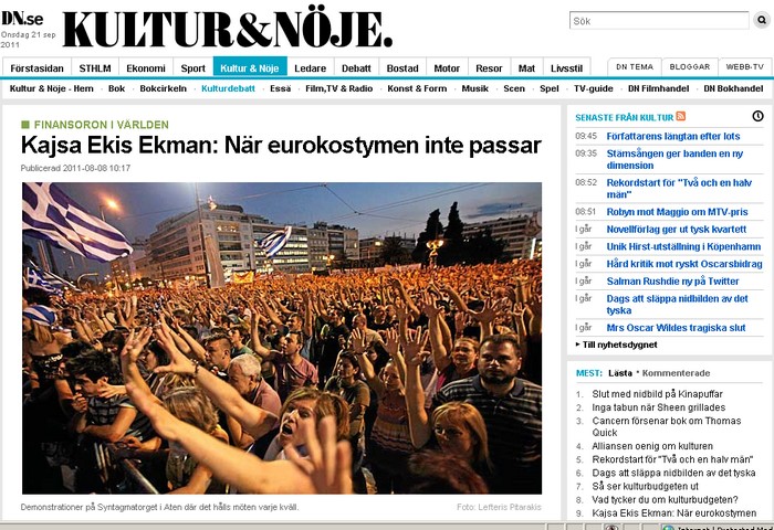 Το άρθρο της Σουηδέζας δημοσιογράφου, Κάισα Έκις Έκμαν, για την κρίση χρέους της Ελλάδας, με τίτλο "Όταν το ευρω-κοστούμι δεν ταιριάζει" προκάλεσε ποικίλες αντιδράσεις και απέκτησε τεράστια δημοφιλία. Διαβάστε στο NEWS 247 πώς αντέδρασαν οι Σουηδοί