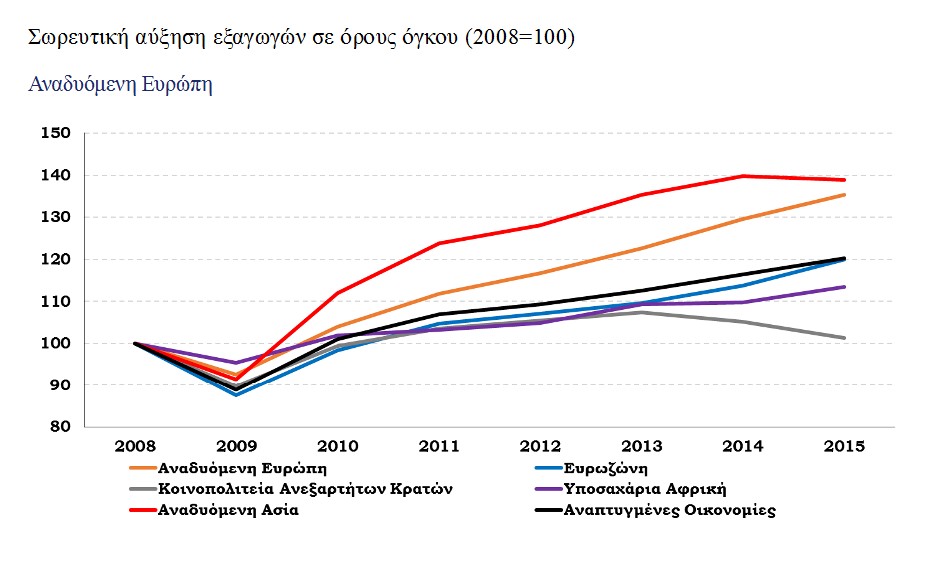 Χαρακτηριστική είναι ότι την περίοδο 2010-2015, έξι οικονομίες της ευρύτερης περιοχής (Κροατία, Λετονία, Ουγγαρία, Πολωνία, Ρουμανία, Τσεχία) σημείωσαν διψήφια προσαρμογή της πραγματικής συναλλαγματικής ισοτιμίας σε όρους μοναδιαίου κόστους εργασίας, όπως και η Ελλάδα. Εντούτοις, πέτυχαν σημαντικά μεγαλύτερη αύξηση των εξαγωγών τους σε σύγκριση με την Ελλάδα .Ετσι, σε αντίθεση με την Ελλάδα, το ποσοστό εξαγωγών αγαθών υψηλής τεχνολογίας στις συνολικές εξαγωγές αγαθών των οικονομιών της Κεντρικής, Ανατολικής & ΝΑ Ευρώπης αυξήθηκε την περίοδο 2008 – 2015 .