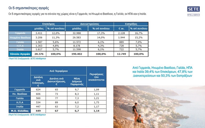Εντυπωσιακή είναι η παρουσία της γερμανικής και της βρετανικής αγοράς σχεδόν σε όλες τις Περιφέρειες ειδικά με όρους Διανυκτερεύσεων και Εισπράξεων: δεν υπάρχει ούτε μια Περιφέρεια που τουλάχιστον η μια από τις δύο χώρες να μην συγκαταλέγεται στο top-3 των αγορών της Περιφέρειας. Μάλιστα σε οχτώ Περιφέρειες συγκαταλέγονται και οι δύο αγορές στο top-3.