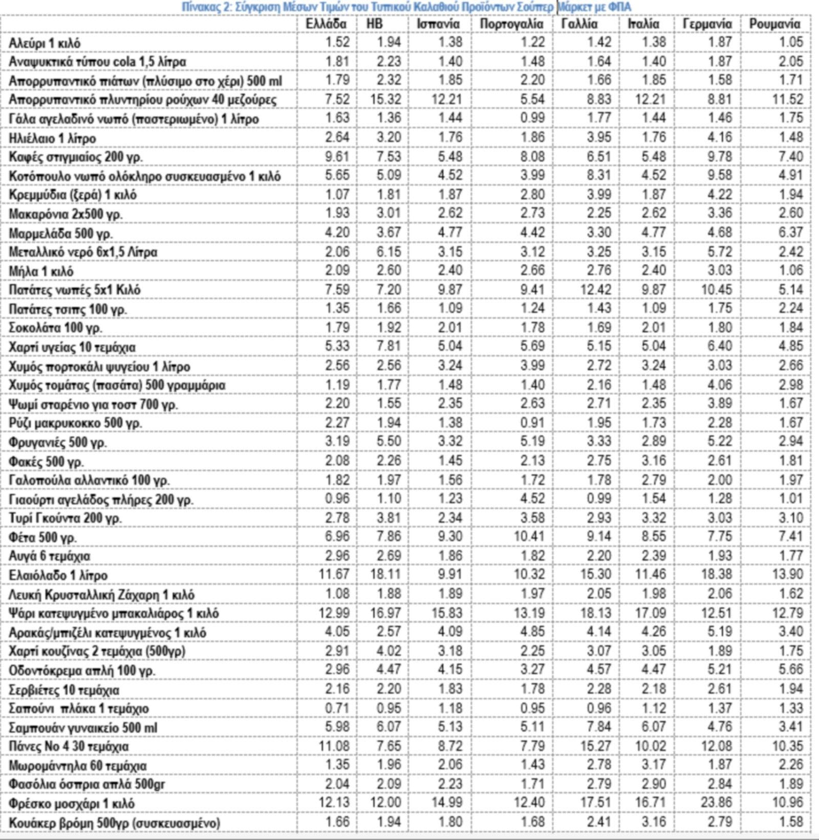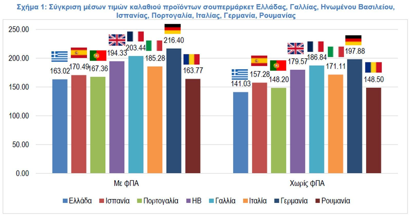 Η σύγκριση των μέσων τιμών των καλαθιών (πίνακας 1) δείχνει ότι και οι τέσσερεις χώρες έχουν σημαντικά ακριβότερο μέσο καλάθι από την Ελλάδα, 33% η Γερμανία, 25% η Γαλλία, 19% το Ηνωμένο Βασίλειο, 14% η Ιταλία, ενώ ακριβότερο κατά 3% η Πορτογαλία, 5% η Ισπανία και η Ρουμανία είναι περίπου στο ίδιο επίπεδο με την Ελλάδα.