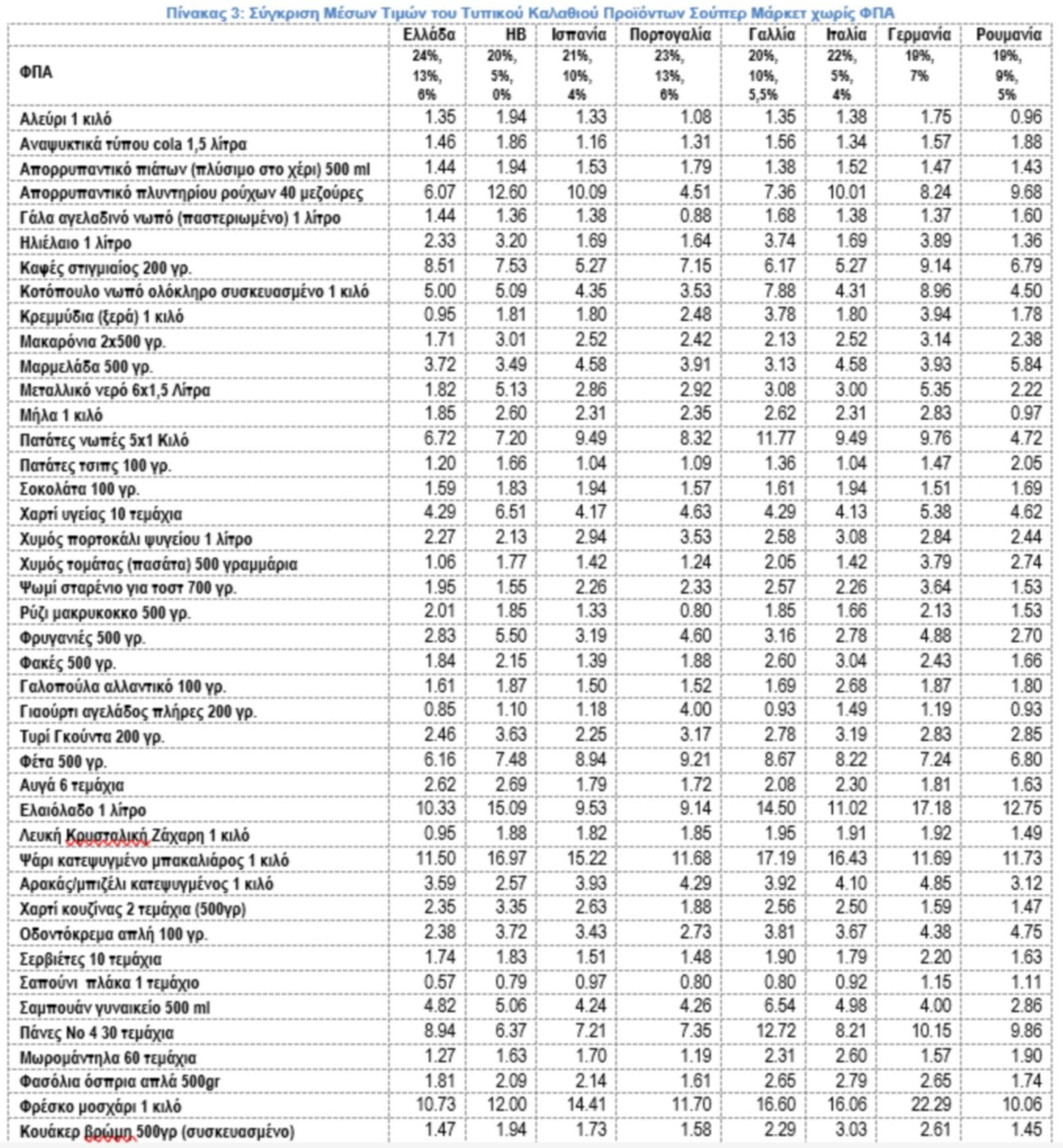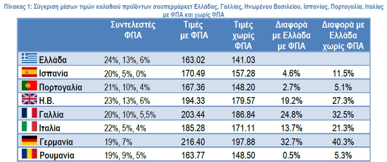 Η εικόνα των αποτελεσμάτων αλλάζει σημαντικά όταν αφαιρέσουμε τον αναλογούντα ΦΠΑ ανά χώρα για να γίνουν αντιληπτές οι πραγματικές τιμές των προϊόντων σουπερμάρκετ. Η σύγκριση των καλαθιών σε αυτή την περίπτωση (σχήμα 1 και πίνακας 1) δείχνει ότι οι και οι επτά χώρες έχουν πιο ακριβό μέσο καλάθι από την Ελλάδα, η Γερμανία κατά 40%, η Γαλλία κατά 33%, το Ηνωμένο Βασίλειο κατά 27%, η Ιταλία κατά 21%, η Ισπανία κατά 12% η Πορτογαλία κατά 5% και η Ρουμανία κατά 5%.