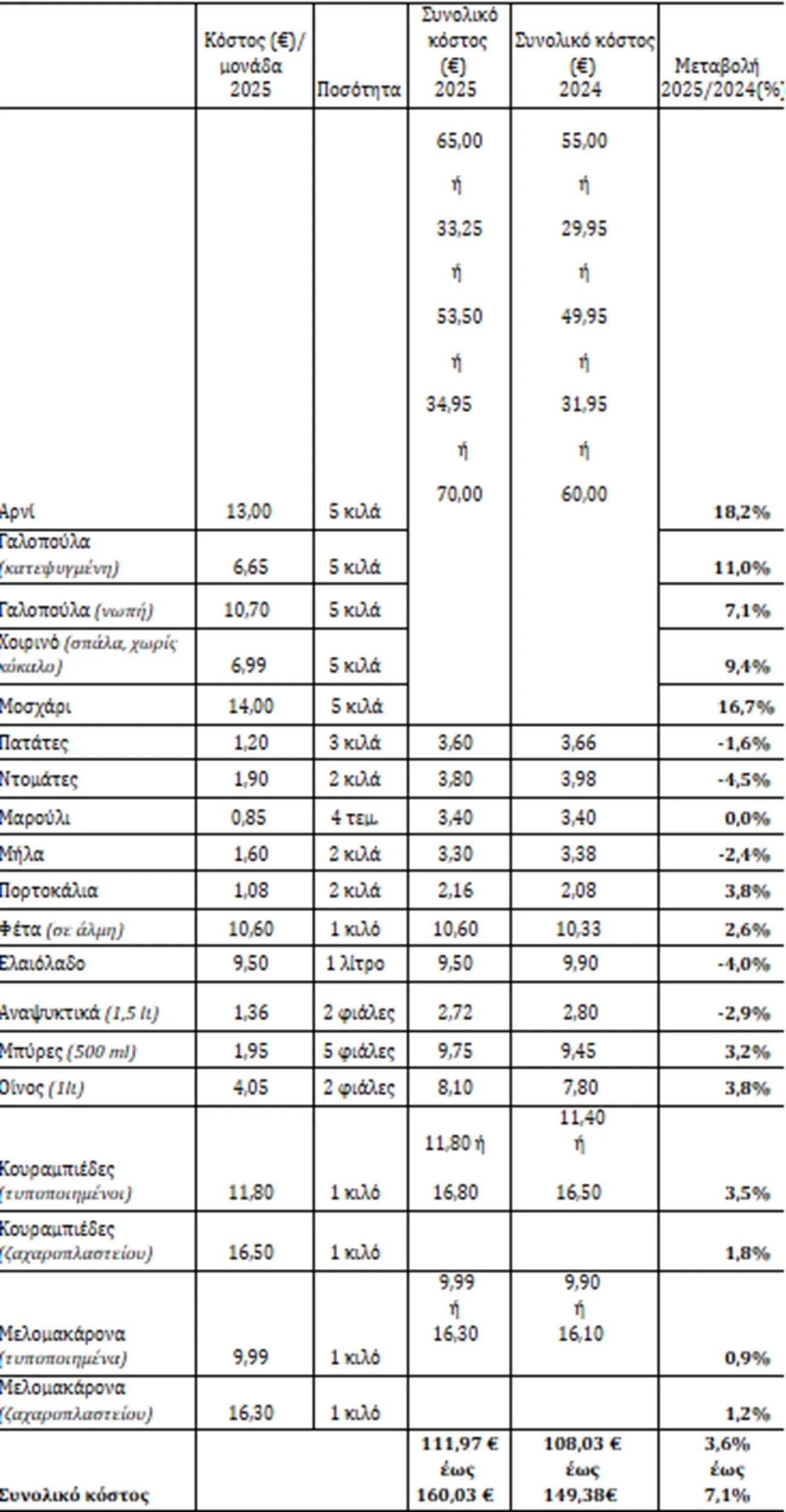 Το κόστος εμφανίζεται αυξημένο από 3,6% έως 7,1% σε σύγκριση με το αντίστοιχο τραπέζι του 2024. Στο πλαίσιο της έρευνας του ΙΝΕΜΥ ΕΣΕΕ καταγράφηκαν, με επιτόπια τιμοληψία και συνεντεύξεις με key-informers της αγοράς, οι τιμές τόσο από αλυσίδες σούπερ μάρκετ όσο και από ειδικευμένα καταστήματα λιανικής (πχ ζαχαροπλαστεία/ κρεοπωλεία κτλ), καθώς και από τη Βαρβάκειο αγορά.