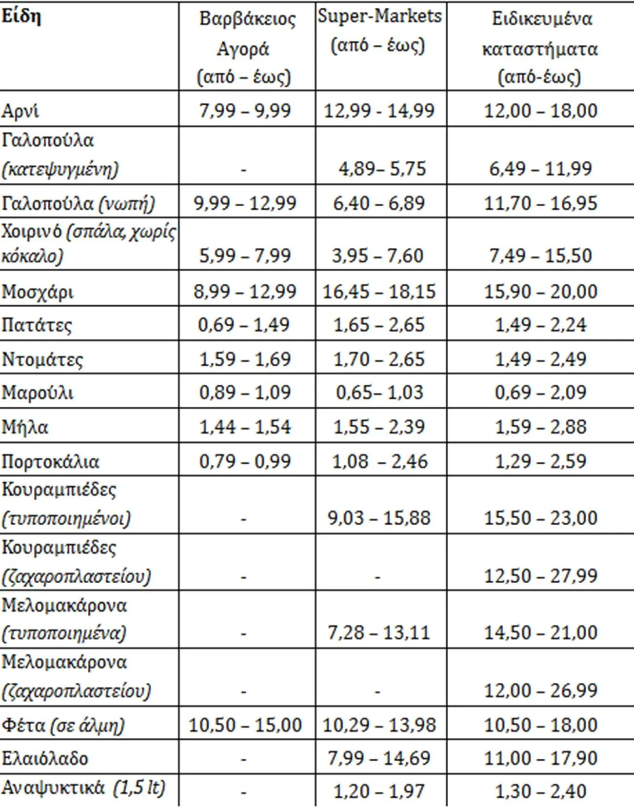 Όπως διευκρινίζεται από το Ινστιτούτο, το εύρος των τιμών δικαιολογείται από την καταγραφή σειράς προϊόντων διαφορετικής ποιότητας, σε αρκετές τοπικές αγορές και διαφορετικούς τύπους καταστημάτων. Επιπλέον, διευκρινίζεται ότι οι τιμές των προϊόντων που εμφανίζονται στους ακόλουθους Πίνακες (1 & 2) είναι ενδεικτικές και επιχειρούν να χαρτογραφήσουν τη γενική διάρθρωση τιμών και την εικόνα της αγοράς.