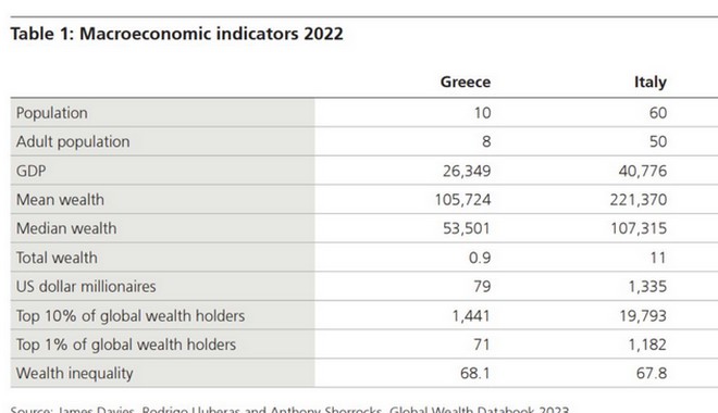 Όπως, δε, φαίνεται, μεταξύ 2000 και 2022, ο πλούτος ανά ενήλικα αυξήθηκε με μέσο ετήσιο ρυθμό 1,8% στην Ελλάδα, 2,8% στην Ιταλία και 5% στην Ισπανία, αυξάνοντας το χάσμα πλούτου μεταξύ της Ελλάδας και των άλλων δύο χωρών. Σε όρους δολαρίου, ο πλούτος ανά ενήλικα μειώθηκε κατά 2,3% στην Ελλάδα το 2022, 6,1% στην Ιταλία και 2,4% στην Ισπανία. Ωστόσο, σε όρους ευρώ, ο πλούτος ανά ενήλικα αυξήθηκε κατά 3,7% τόσο στην Ελλάδα όσο και στην Ισπανία και μειώθηκε ελαφρά στην Ιταλία κατά 0,3%.