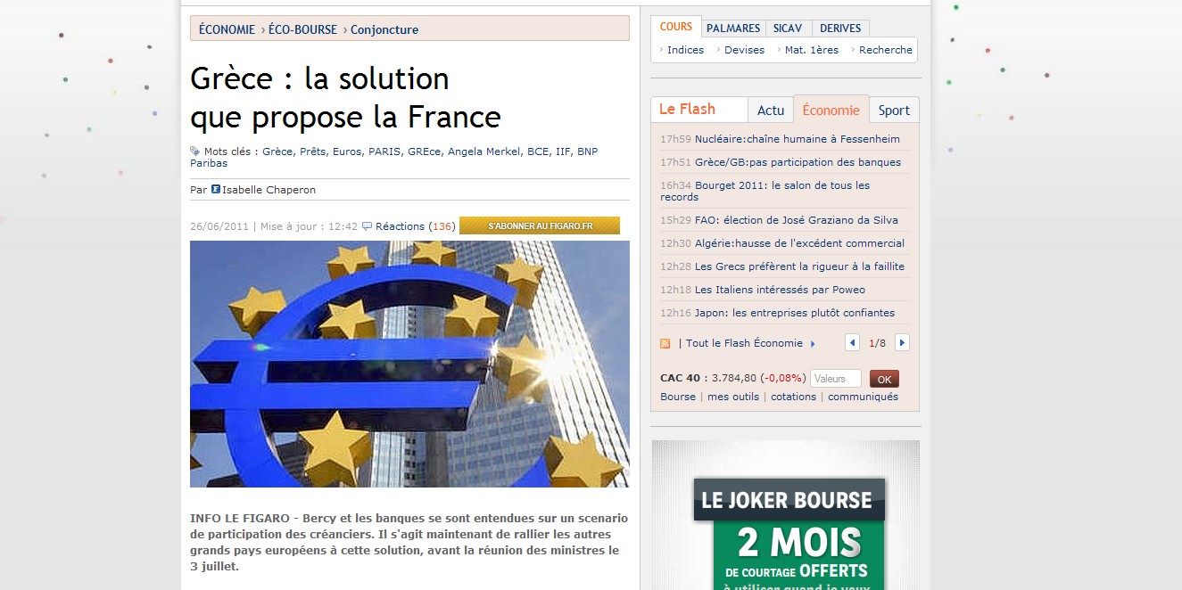 Κυβέρνηση και τράπεζες συμφώνησαν σε σχέδιο επανεπένδυσης των ελληνικών ομολόγων, σύμφωνα με δημοσίευμα της Le Figaro. Παρέμβαση για τα ελληνικά επιτόκια ζητά ο Γιούνκερ
