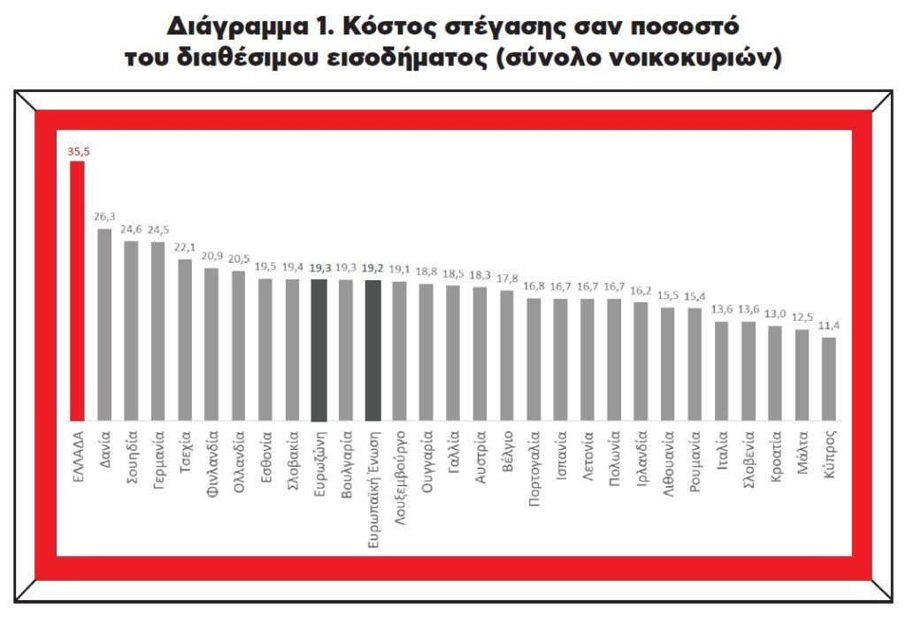 Η γενική κατάσταση στην Ελλάδα είναι λίγο πολύ γνωστή. Όπως βλέπουμε στο διάγραμμα 1, η Ελλάδα έχει με διαφορά το υψηλότερο κόστος στέγασης μεταξύ των χωρών της Ευρωπαϊκής Ένωσης. Με απλά λόγια, το μέσο νοικοκυριό στην Ελλάδα ξοδεύει το 35,5% του διαθέσιμου εισοδήματος για τη στέγη. Ακολουθεί η Δανία με σχεδόν δέκα μονάδες λιγότερες, στο 26,3% ενώ ο μέσος όρος της Ευρωπαϊκής Ένωσης είναι 19,2%. Πρόκειται για άλλη μια θλιβερή πρωτιά της χώρας μας.