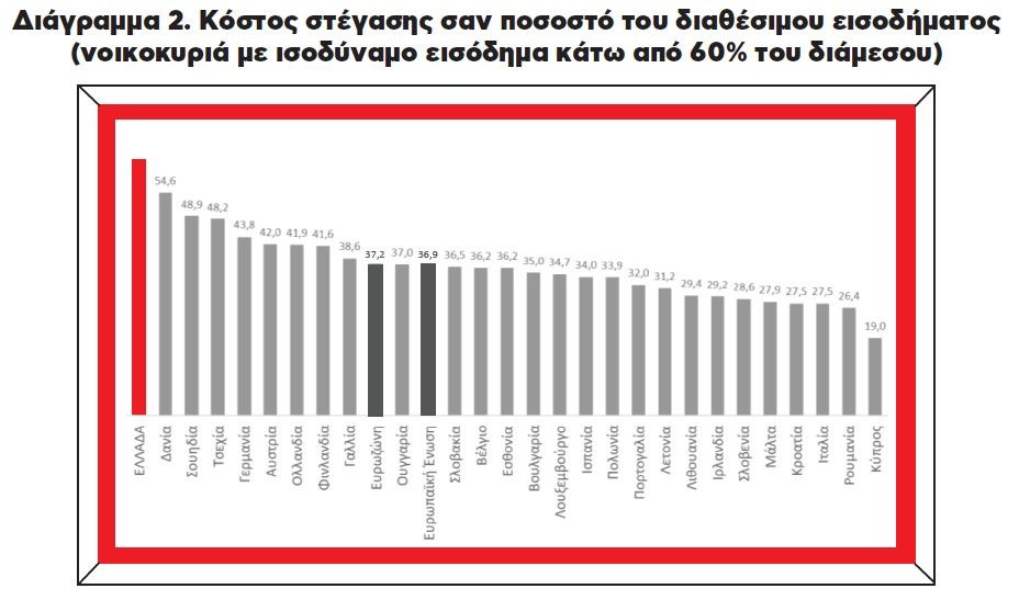 Η εικόνα είναι μάλλον δραματική καθώς βλέπουμε ότι τα φτωχά νοικοκυριά ξοδεύουν σχεδόν τα 2/3 του διαθέσιμου εισοδήματός τους για την κάλυψη των αναγκών στέγασης. Η Ελλάδα παραμένει φυσικά στην πρώτη θέση με δεύτερη τη Δανία. Ο μέσος όρος της Ευρωπαϊκής Ένωσης είναι στο 36,9%, δηλαδή ελάχιστα υψηλότερο από τον μέσο όρο των νοικοκυριών στην Ελλάδα. Με άλλα λόγια, το ποσοστό του διαθέσιμου εισοδήματος που δαπανά για τη στέγαση ένα μέσο ελληνικό νοικοκυριό είναι περίπου ίσο με το ποσοστό που ξοδεύει ένα φτωχό ευρωπαϊκό νοικοκυριό.