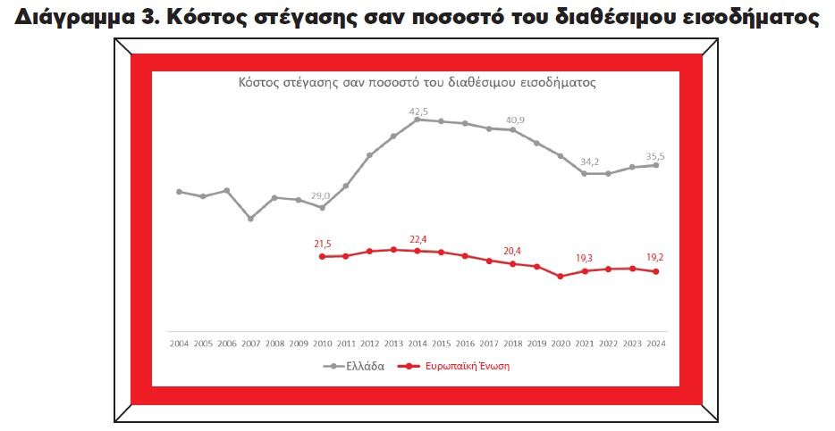 Αξίζει, τέλος, να δούμε τη διαχρονική εξέλιξη του κόστους στέγασης στην Ελλάδα και την Ευρωπαϊκή Ένωση για να δούμε αν το πρόβλημα είναι σχετικά πρόσφατο ή υπήρχε από το παρελθόν. Το διάγραμμα 3 δείχνει την εξέλιξη του κόστους στέγασης στην Ελλάδα (από το 2004) και την Ευρωπαϊκή Ένωση (από το 2010).