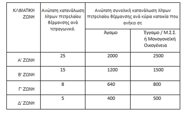 3. Για κάθε κατοικία, ανεξαρτήτως ζώνης, χορηγείται επίδομα σε άγαμους για τα πρώτα 80 τετραγωνικά μέτρα και για τα πρώτα 100 μέτρα για τους έγγαμους και τις μονογονεϊκές οικογένειες, με ανώτατη κατανάλωση πετρελαίου θέρμανσης ανά κλιματική ζώνη και ανά τετραγωνικό ως ακολούθως:
