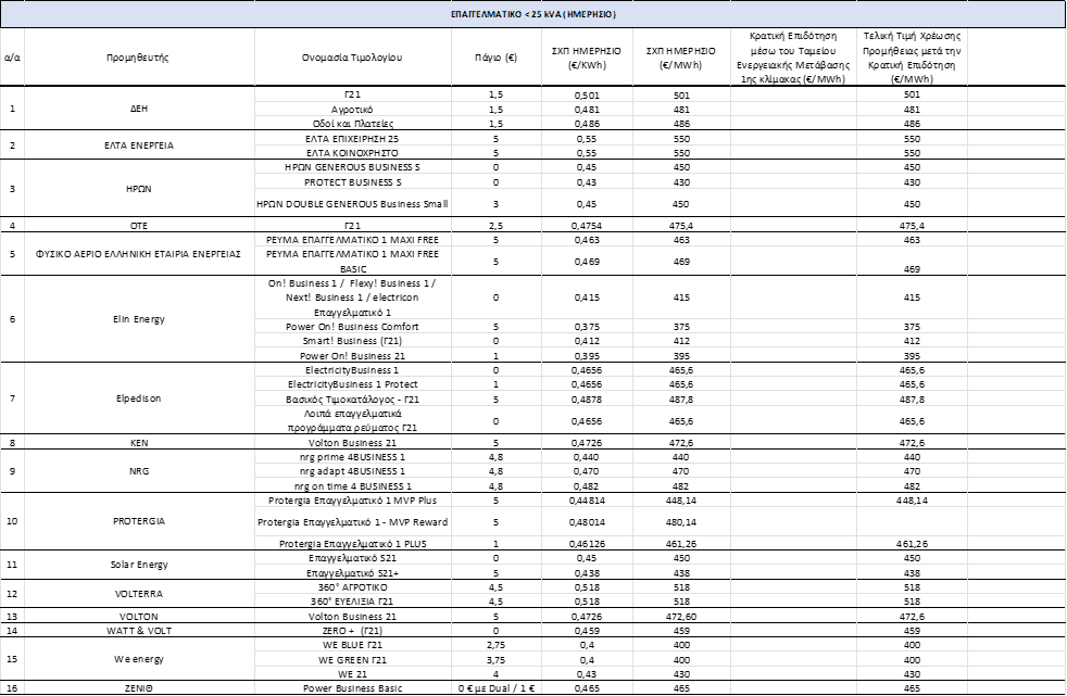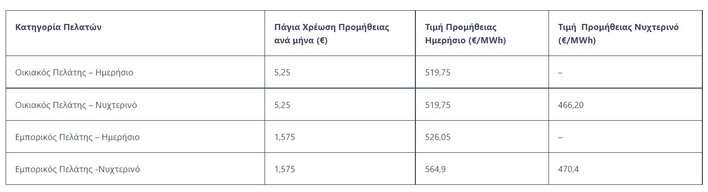 Ως εκ τούτου, για την κατηγορία «Οικιακός Πελάτης – Ημερήσιο Τιμολόγιο» ως Τιμολόγιο Αναφοράς ορίζεται το τιμολόγιο «myHome Open» του Προμηθευτή ««ΔΕΗ Α.Ε.». Περαιτέρω, για την κατηγορία «Οικιακός Πελάτης – Νυχτερινό Τιμολόγιο» ως Τιμολόγιο Αναφοράς ορίζεται το τιμολόγιο «myHome Open» του Προμηθευτή «ΔΕΗ Α.Ε.», για την κατηγορία «Εμπορικός Πελάτης – Ημερήσιο Τιμολόγιο» ως Τιμολόγιο Αναφοράς ορίζεται το τιμολόγιο «Γ21» του Προμηθευτή «ΔΕΗ Α.Ε.» και για την κατηγορία «Εμπορικός Πελάτης -Νυχτερινό Τιμολόγιο» ως Τιμολόγιο Αναφοράς ορίζεται το τιμολόγιο «Γ23» του Προμηθευτή «ΔΕΗ Α.Ε.».