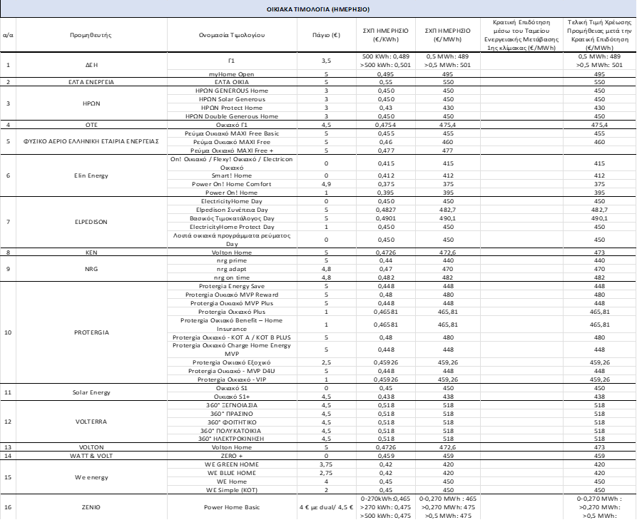 Πίνακας 1: Κατηγορία: Οικιακός Πελάτης – Ημερήσιο Τιμολόγιο