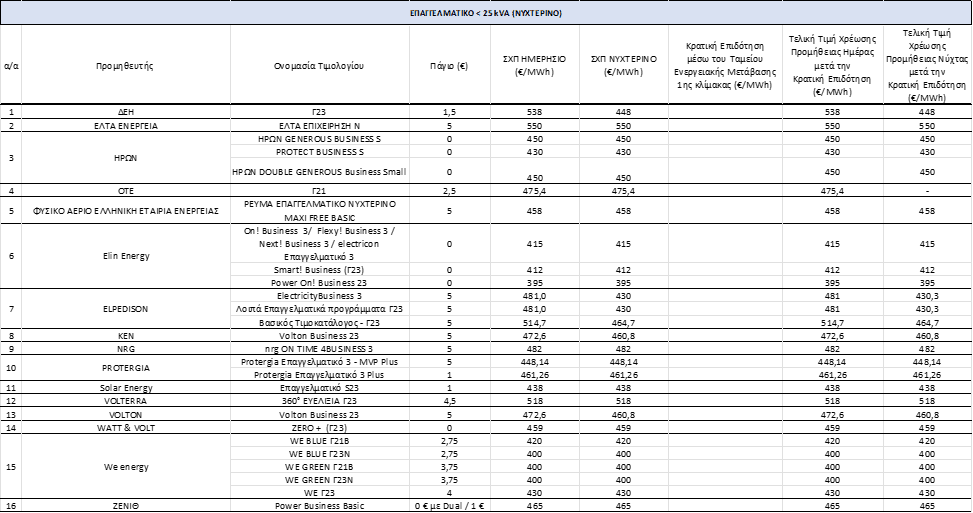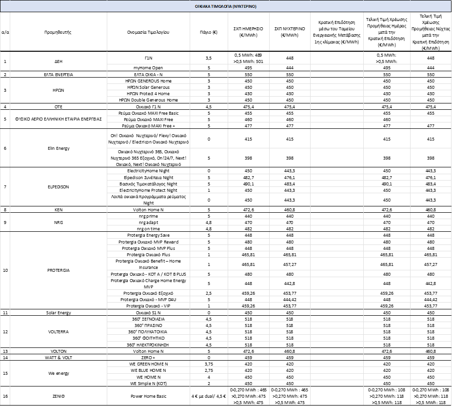Πίνακας 2: Κατηγορία: Οικιακός Πελάτης – Νυχτερινό Τιμολόγιο